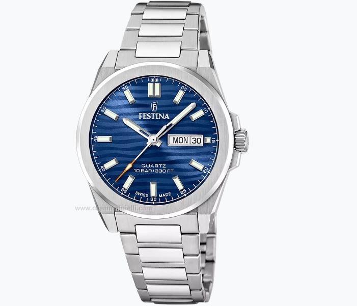 orologio da donna solo tempo festina della collezione swiss made con funzioni di solo tempo, cassa in acciaio inossidabile 316l del diametro di 40 mm, quadrante blu, datario e giorno della settimana ad ore 3. il cinturino è in acciaio inossidabile 316l. vetro zaffiro. movimento al quarzo, la resistenza all'acqua è di 10 atmosfere.