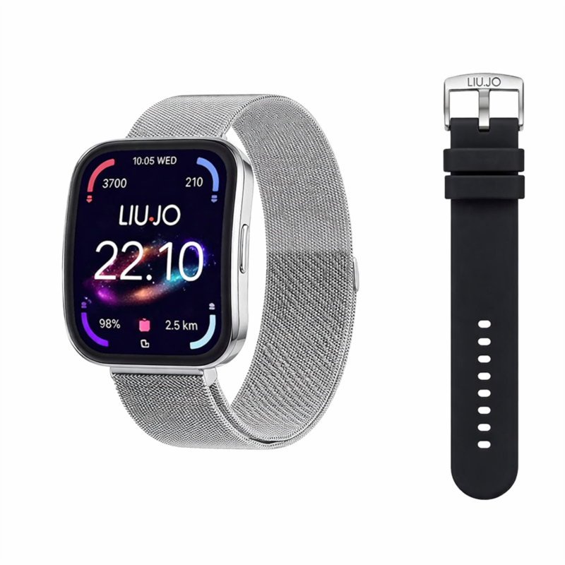 smartwatch unisex liu jo, appartenente alla collezione curve silver , cassa in metallo 47mmx38mm, cinturino in maglia milano , resistenza all'acqua ip67. incluso nella confezione anche un secondo cinturino in silicone nero con fibbia silver personalizzata liu jo. funzioni: chiamata vocale tramite dispositivo e avviso notifica assistente vocale sport pedometro calorie controllo del sonno avviso sedentarietà cronometro timer accensione dello schermo con movimento del polso frequenza cardiaca, pressione sanguigna ossigenazione, controllo della musica da remoto scatto meteo sveglia sfondo personalizzabile trova telefono