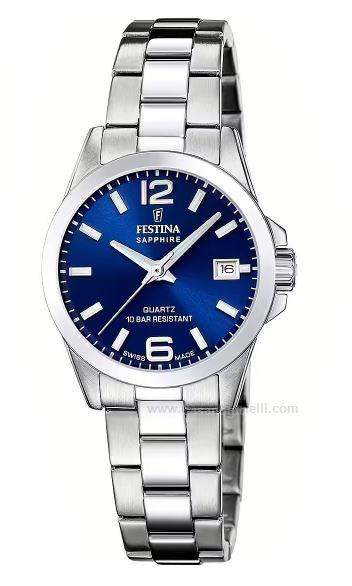 orologio da donna solo tempo festina della collezione swiss made, cassa in acciaio del diametro di 29 mm, quadrante blu con datario ad ore 3, lancette e indici fosforescenti, vetro in zaffiro. il cinturino è in acciaio e il movimento è al quarzo, la resistenza all'acqua è di 10 atmosfere.